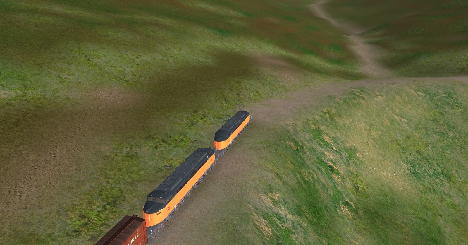 Tags: Trainz: A New Era, Milwaukee Road Avery-Drexel, MILW - Transcontinental Westbound Freight Train (summer time), TUME-71001753-MILW-EF4, TUME-71402175-SD40-2-BN, TUME-300501-Boxcar-50ft-MILW, TUME-300502-Boxcar-50ft-MILW, TUME-300511-Boxcar-50ft-GN, TUME-300512-Boxcar-50ft-GN, TUME-300510-Boxcar-50ft-UP, TUME-300509-Boxcar-50ft-UP, TUME-300513-Boxcar-50ft-CN, TUME-300514-Boxcar-50ft-CN