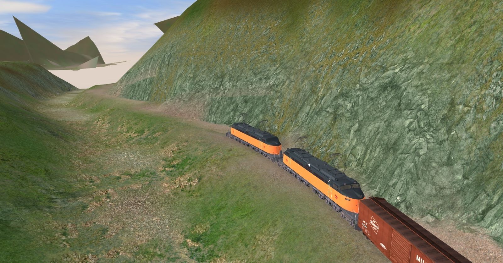 Tags: Trainz: A New Era, Milwaukee Road Avery-Drexel, MILW - Transcontinental Westbound Freight Train (summer time), TUME-71001753-MILW-EF4, TUME-300502-Boxcar-50ft-MILW, TUME-300501-Boxcar-50ft-MILW