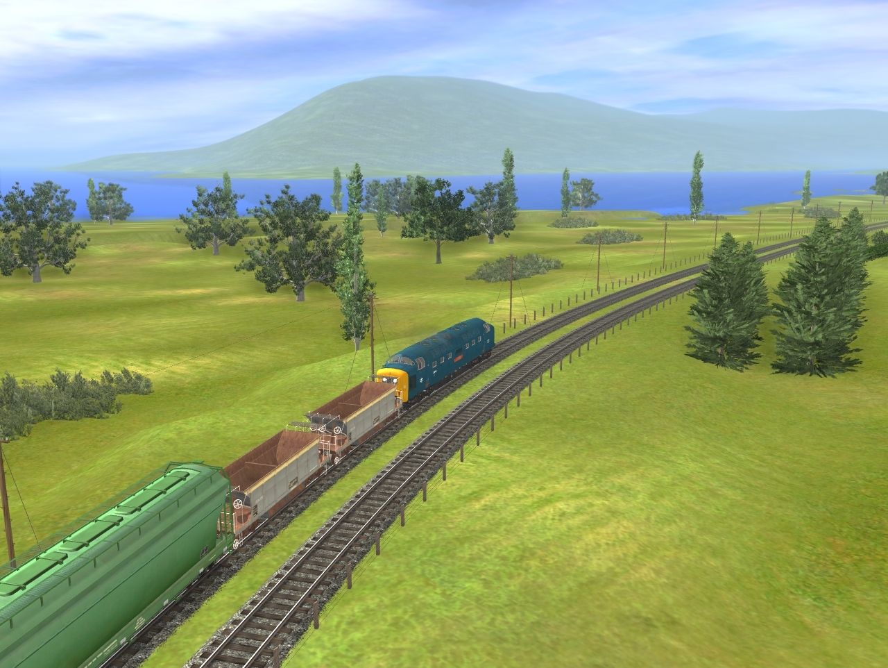 Tags: Trainz: A New Era, Fort William-Mallaig TANE Procedural 1, Default, BR Class 55 blue TOPS 1976, Log Wagon, BN grain hopper 4 bay #481523, BR YGH Dutch, Log Wagon Short Knuckle, 70ton AAR Flatcar C&O