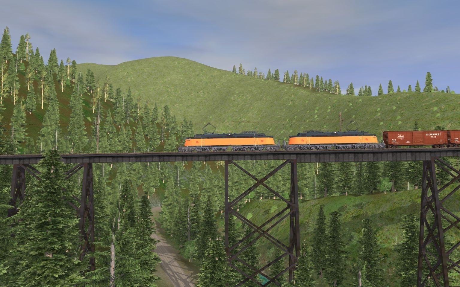 Tags: Trainz: A New Era, Milwaukee Road Avery-Drexel, MILW - Transcontinental Westbound Freight Train (summer time), TUME-71001753-MILW-EF4, TUME-300501-Boxcar-50ft-MILW, TUME-300502-Boxcar-50ft-MILW, TUME-300503-Boxcar-50ft-MILW, TUME-300504-Boxcar-50ft-MILW, TUME-300592-Flatcar-MILW, TUME-300595-Flatcar-UP, TUME-300598-Flatcar-UP, TUME-300513-Boxcar-50ft-CN, TUME-300514-Boxcar-50ft-CN, TUME-300509-Boxcar-50ft-UP