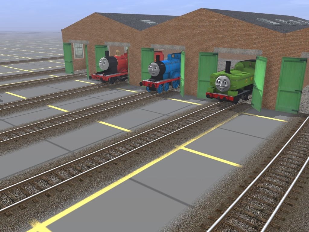 Tags: Trainz: A New Era, swag track, Default, Duck The Great Western Engine 2012, Edward The Blue Engine 2012, SW1500 IORY 1501 Indiana & Ohio Railway, CGI James the Red Engine 2012, ATSF GP60M, Edward's Tender 2012, CGI James' Tender 2012, BR Mk1 BFK Blue, BR HEA brown, BR Freight CAR Brake Bauxite, BR standard van