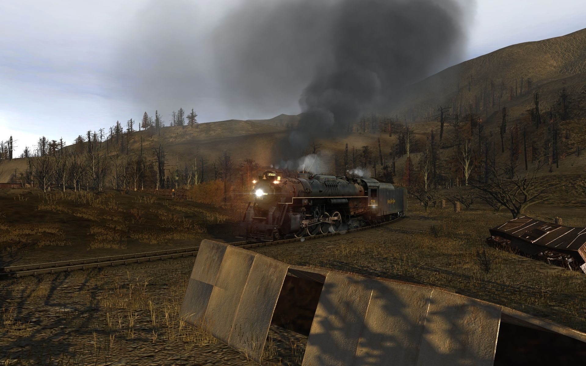 Tags: Trainz: A New Era, Whirlpool Rail, Whirlpool Rail Session, NKP S-2 Weathered, NKP S-2 Tender Weathered, CNW F7B #315 derelict, DB ES wagon Coal, Coal 2 Bay Hopper Ford #MFX, Log Wagon Short Knuckle, 40ft Boxcar NKP