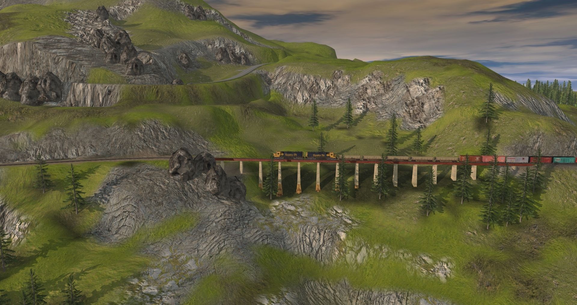 Tags: Trainz: A New Era, Kickstarter County, Trees for Life, ATSF SD45, Log Wagon Short Knuckle, 40ft Boxcar SSW 01, 40ft Boxcar SP 01, 40ft Boxcar SAL 01, 40ft Boxcar PM 01, 40ft Boxcar NYC 01, ATSF Ce-11 Caboose