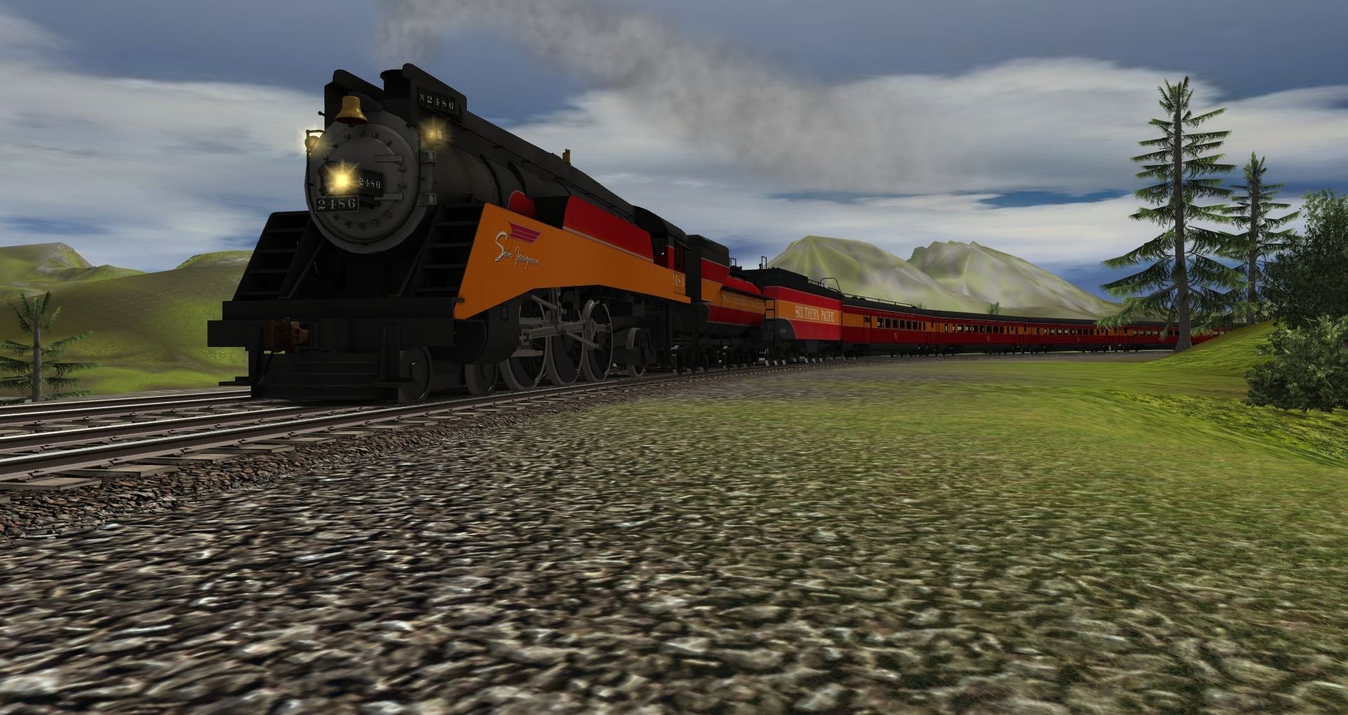 Tags: Trainz: A New Era, Kickstarter County, Southern Pacific Class P-10 4-6-2 - San Joaquin Daylight, Southern Pacific P-10 Tender Daylight, SP GS-5 Tender Daylight Postwar, SP Coast Daylight Baggage-Chair Car, SP Coast Daylight Chair Car, SP Coast Daylight Articulated Chair Car - ACM, SP Coast Daylight Parlor-Observation Car