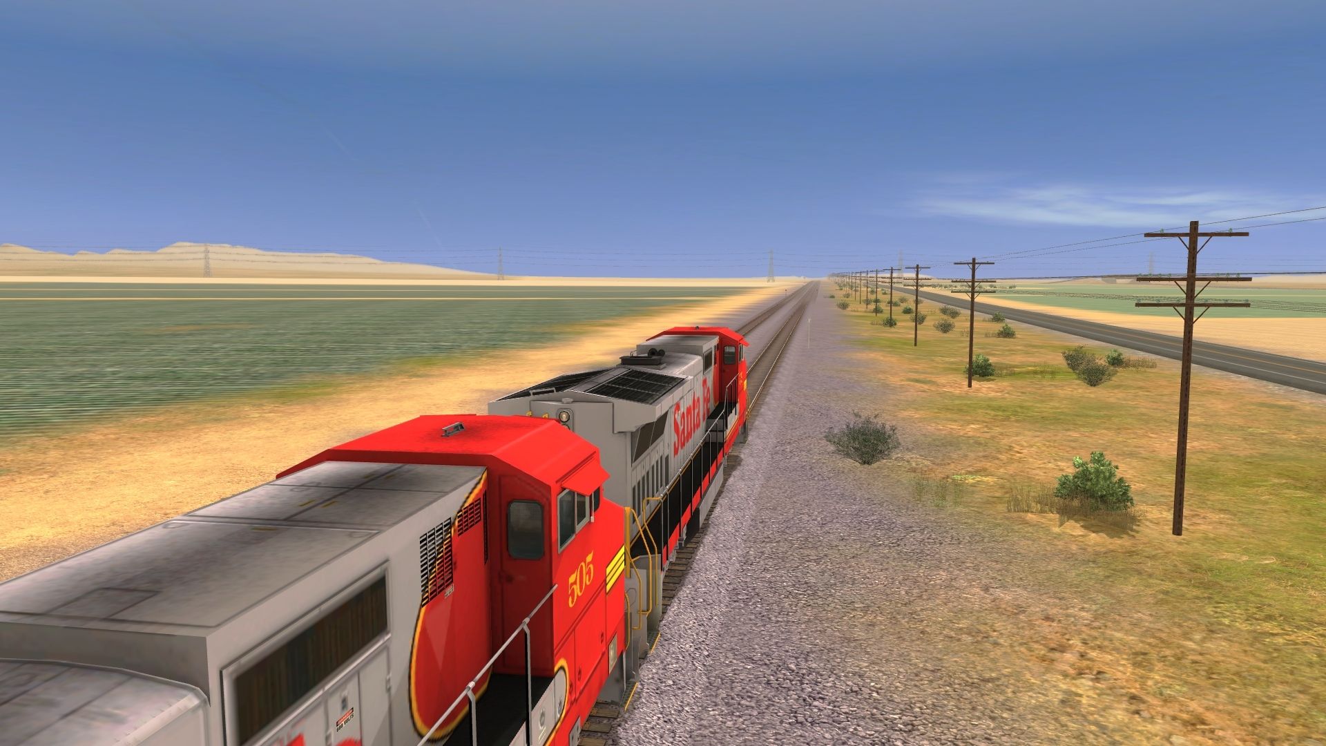 Posted by: bendoverxyz | Posted:2017-11-28 01:24:16 Caption: Tags: Trainz: A New Era, Mojave Sub Division, ATSF #991 East, ATSF GP60B, ATSF B40-8W, ATSF GP60M, TTX 89ft TOFC Flatcar