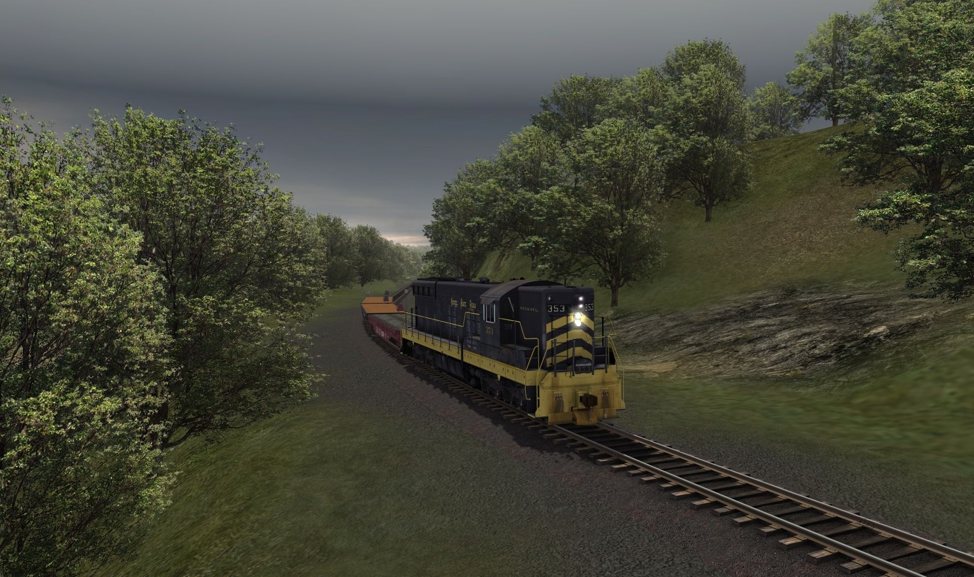 Tags: Trainz: A New Era, Coal Country, 1, NKP SD9 clean skin, Flatcar50ft C&N W RY h#, Flatcar50ft Nickel Plate Road 2 h#, Log Wagon Short Knuckle, NW 100 Ton Hopper 1, NW 100 Ton Hopper 2, NKP Caboose 400 Series