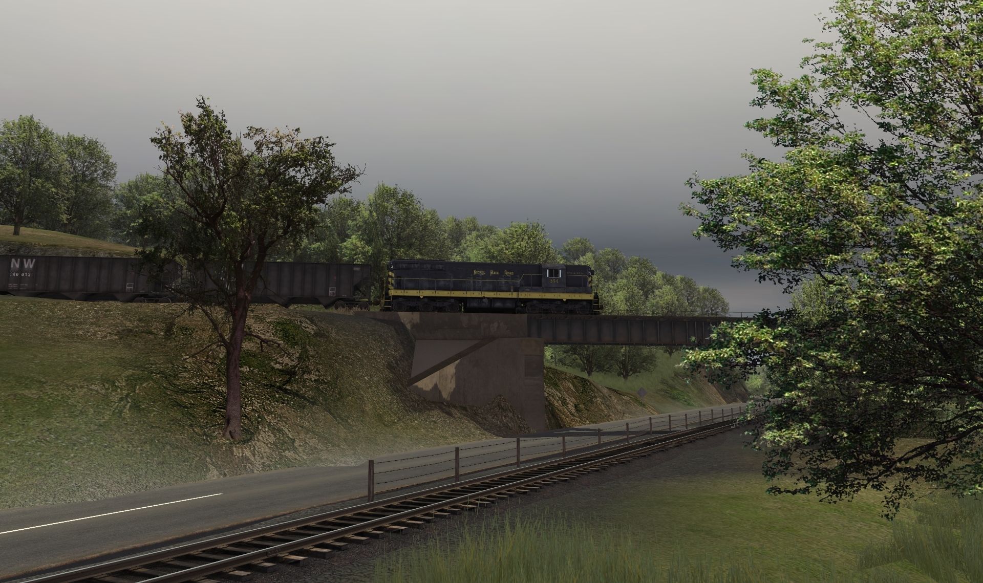 Tags: Trainz: A New Era, Coal Country, 1, NKP SD9 clean skin, NW 100 Ton Hopper 1, NW 100 Ton Hopper 2, NKP Caboose 400 Series, Log Wagon Short Knuckle