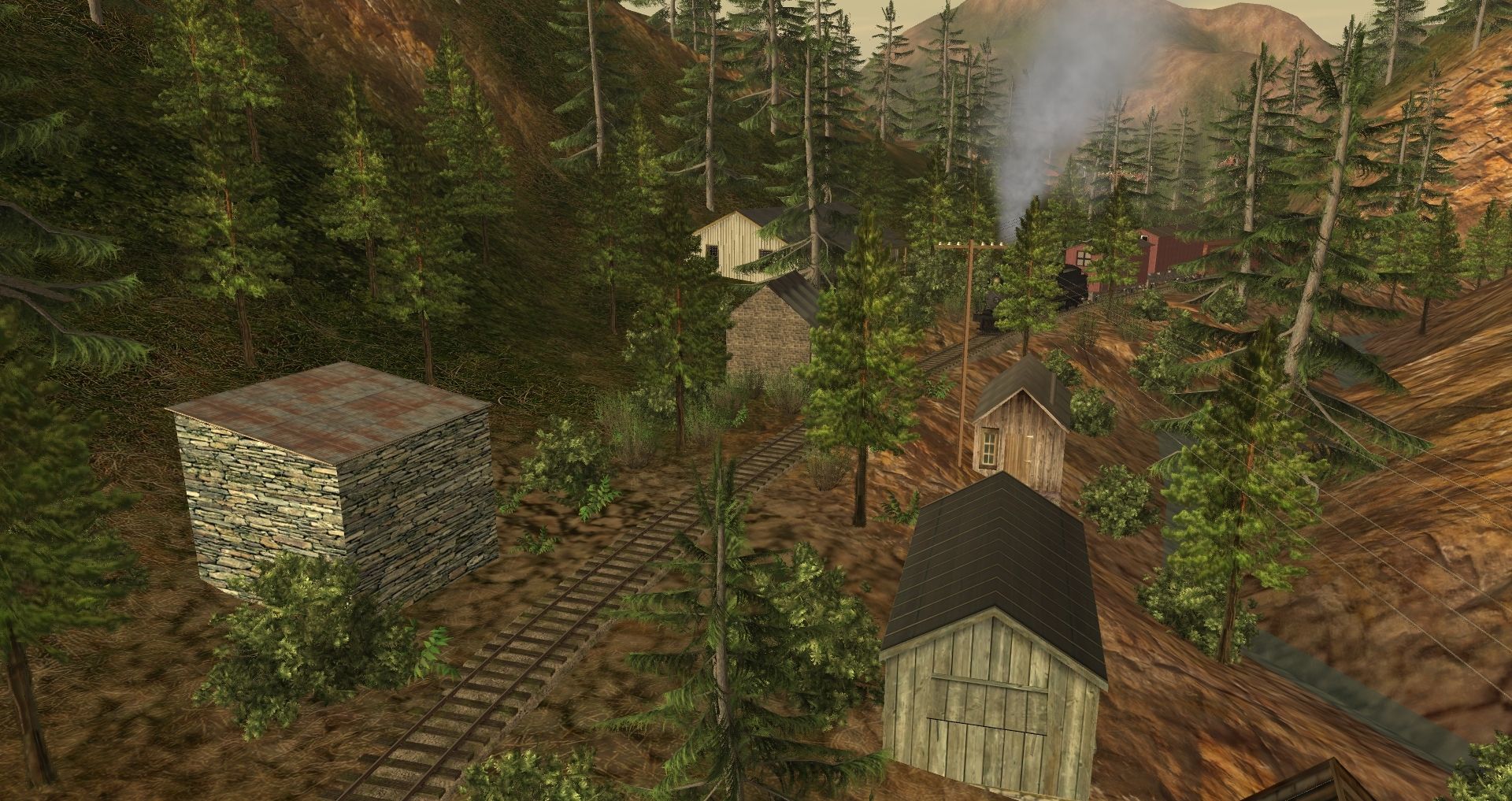 Tags: Trainz: A New Era, Berseria Northern RR, Default, C&S No. 5, 30in 3-Truck Shay, C&S No. 5 Tender, Double hut fixed wagon, Dormitory/Bunk house on wagon, 30ng Boxcar 30 foot, C&S Combine 20, WP&Y_Flatcar_5, C&S Gondola 4419
