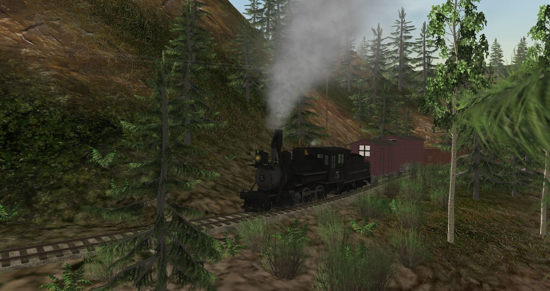 Tags: Trainz: A New Era, Berseria Northern RR, Default, C&S No. 5, C&S No. 5 Tender, Double hut fixed wagon, Dormitory/Bunk house on wagon, C&S Combine 20, C&S Gondola 4419, 30ng Boxcar 30 foot