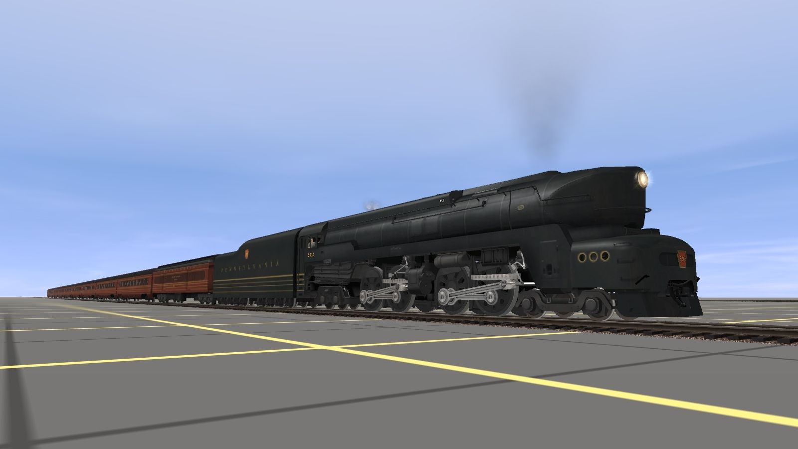 Tags: Trainz: A New Era, Blue High Lands, Default, PRR T1 1945, PRR T1 1945 Tender, PRR FOM B70 Baggage, PRR FOM PS18 Sleeper, PRR FOM POS21A Observation