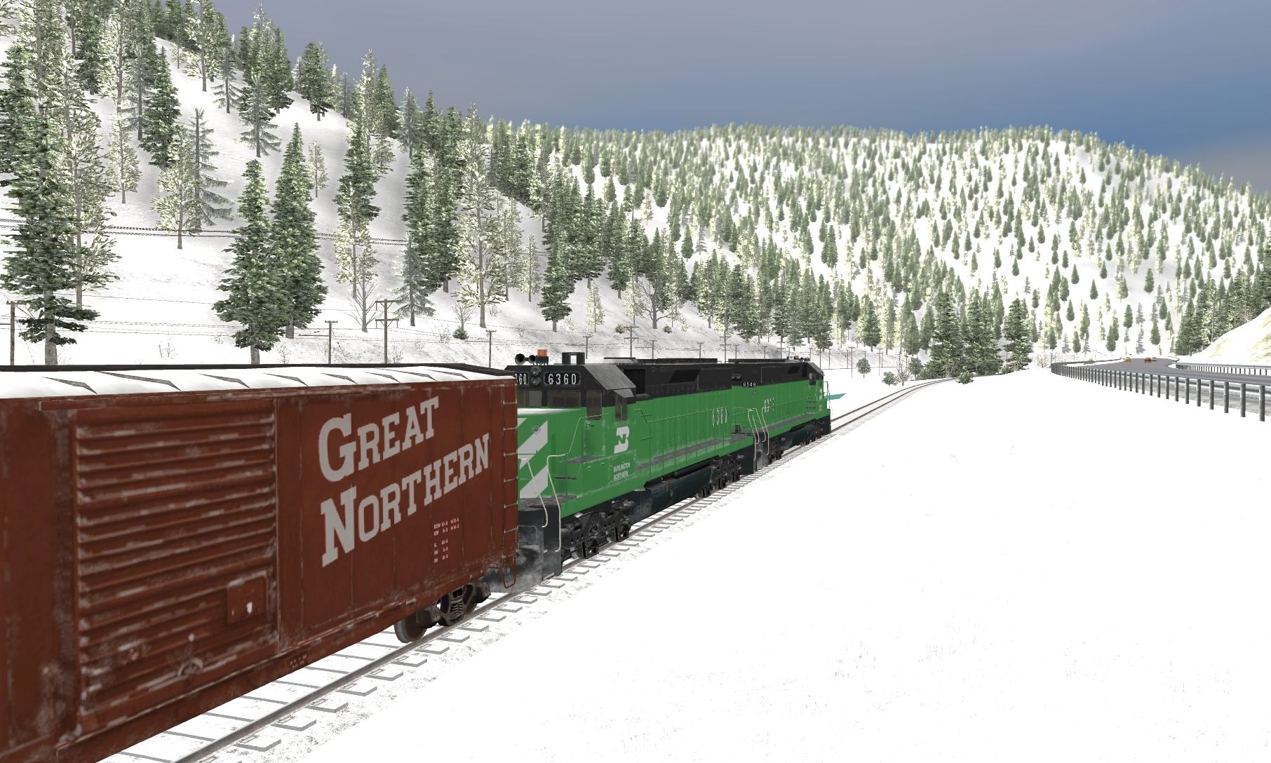Tags: Trainz: A New Era, Milwaukee Road Avery-Drexel, Northern Pacific's Lookout Pass Line (snowy winter), TUME-71402175-SD40-2-BN, TUME-71001753-MILW-EF4, TUME-71402170-SD40-2-MILW, TUME-300501-Boxcar-50ft-MILW, TUME-300502-Boxcar-50ft-MILW, TUME-300503-Boxcar-50ft-MILW, TUME-300504-Boxcar-50ft-MILW, TUME-300591-Trailer-Flatcar-MILW, TUME-300594-Trailer-Flatcar-UP, TUME-300597-Trailer-Flatcar-UP, TUME-300513-Boxcar-50ft-CN