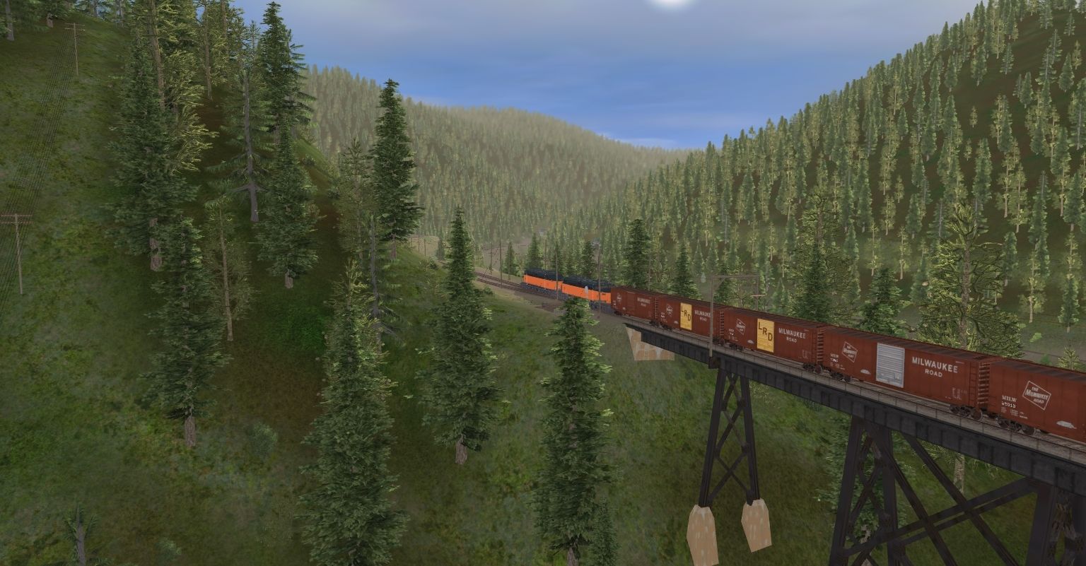 Tags: Trainz: A New Era, Milwaukee Road Avery-Drexel, MILW - Transcontinental Westbound Freight Train (summer time), TUME-71001753-MILW-EF4, TUME-300592-Flatcar-MILW, TUME-300595-Flatcar-UP, TUME-300504-Boxcar-50ft-MILW, TUME-300503-Boxcar-50ft-MILW, TUME-300598-Flatcar-UP, TUME-300513-Boxcar-50ft-CN, TUME-300502-Boxcar-50ft-MILW, TUME-300514-Boxcar-50ft-CN, TUME-300501-Boxcar-50ft-MILW, TUME-300509-Boxcar-50ft-UP
