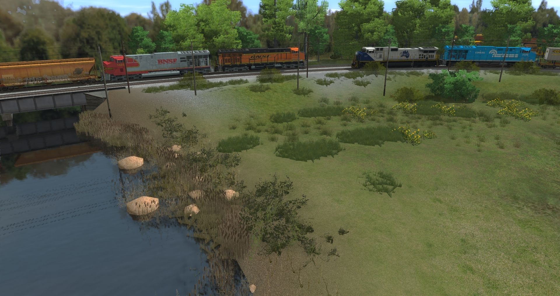 Tags: Trainz: A New Era, HO Conrail STL Line TANE, Default, ES44AC Tier 4 Locomotive BNSF Warbonnet, ES44AC Tier 4 Locomotive BNSF, FMG Dash 9-44CW (As delivered), ES44AC Tier 4 Locomotive NS Conrail Heritage, CNW Centerflow 3 Bay long hatch, CNWX Cylindrical Hopper (graffiti), 52ft Bulkhead BCIT, Flatcar50ft Conrail hw#, CN Rotary Gondola2, TTX Spinecar A, TTX Spinecar E